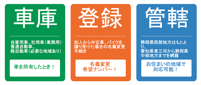 【自動車】■ 名義変更〔移転登録〕 ■ 住所等変更〔変更登録〕 ■ 抹消登録〔一時抹消・永久抹消〕 ■ 車検証・ナンバープレート等再交付 ■ 車庫証明取得手続き〔自動車保管場所証明申請〕 ■ 希望ナンバー取得 など
